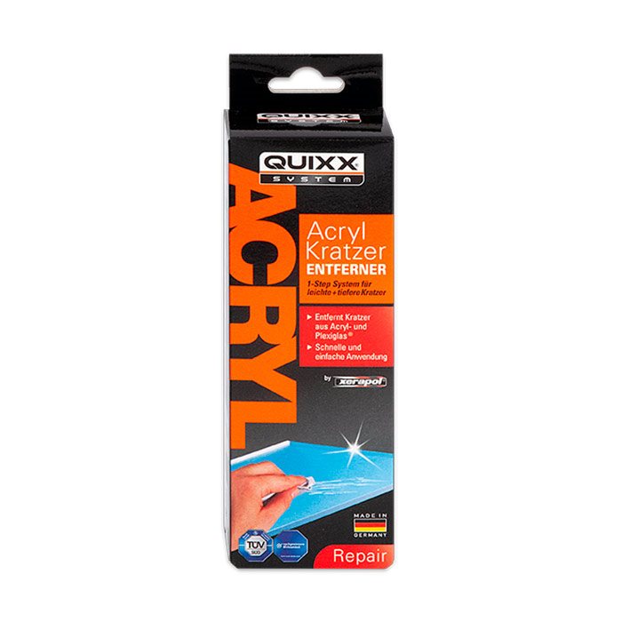 Ved hjælp af den særlige polering fra QUIXX Acryllic Scratch Remover kan dybe og brede ridser i akryl- og Plexiglas®-overflader let, hurtigt og sikkert fjernes. Nye som gamle. På den måde kan du undgå dyre reparationer og endda en eventuel udskiftning af det ridsede.
